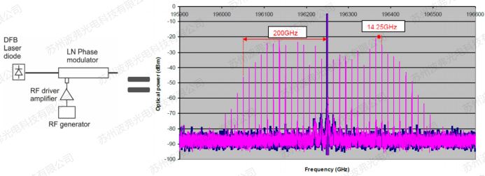在保留載波的情況下,最簡單也是最常用的操作就是通過相位調制器產生邊帶, 舉例如下圖,射頻信號頻率為14.25GHz, 根據驅動電壓強度大小,可以產生10多階邊帶,將載波光譜展寬至400GHz數量級, 入射的載波頻率也被保留。