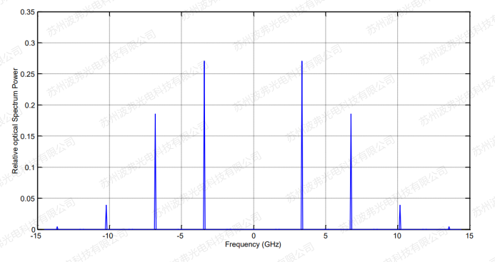 從上圖可以看出,當調制深度為2.4的時候,載波消失,請參考微信文章“電光調制器半波電壓隨頻率的變化”,CS-SSB情況下,下圖為相位調制器輸出光譜的模擬計算結果,載波在”0”所處位置消失,±1階,±2階和±3階邊帶清晰可見,左右對稱分布。