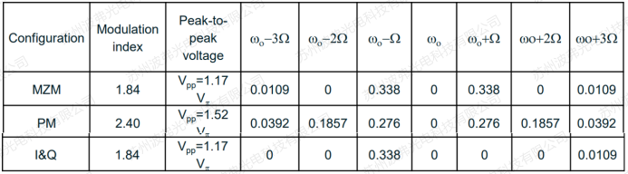 3. 強度調制器所產生的1階邊帶強度高于相位調制器(見下表),因為相位調制器有部分強度分布在其他階邊帶上