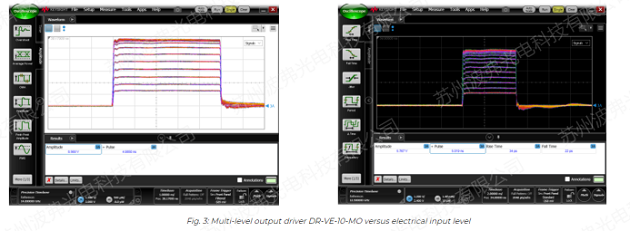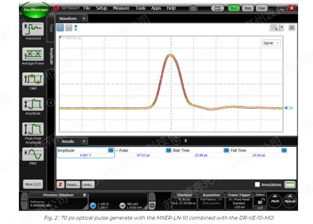 使用AWG,第一調(diào)制塊AM1用于產(chǎn)生超短光脈沖。采用iXblueNIR-MX800、MXER1300和MXER高對比度寬帶幅度調(diào)制器,分別在850nm、1310nm和1550nm處獲得70ps的超短光脈沖。調(diào)制器與驅(qū)動器DR-VE-10-MO相結(jié)合,DR-VE-10-MO可被設(shè)置為方形或高斯脈沖,限幅或線性放大器。采用iXblue偏壓控制器MBC-DG-LAB,在高達數(shù)GHz的脈沖重頻下,獲得了較高的脈沖消光比穩(wěn)定性。