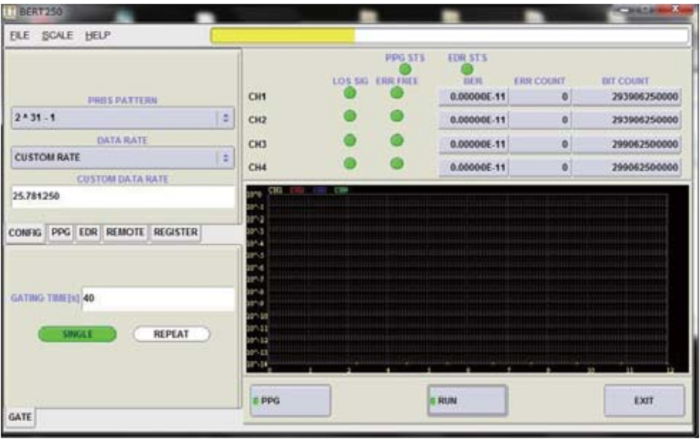 PPG-250C-x-4CH內(nèi)置超穩(wěn)定、低抖動時鐘,EDR-250C-4CH帶有正恢復時鐘 (CDR) 使其非常適合光纖鏈路測試。這些單元可通過USB,GPIB端口程控,可以實現(xiàn)自動測試。