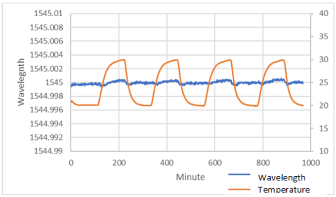 環(huán)境溫度在10°C范圍內循環(huán)時,范圍內任何位置的一般波長的波長與時間的關系。總漂移小于1pm。ClarityPlus可以為C波段的任何波長生成可追溯到NIST的波長。