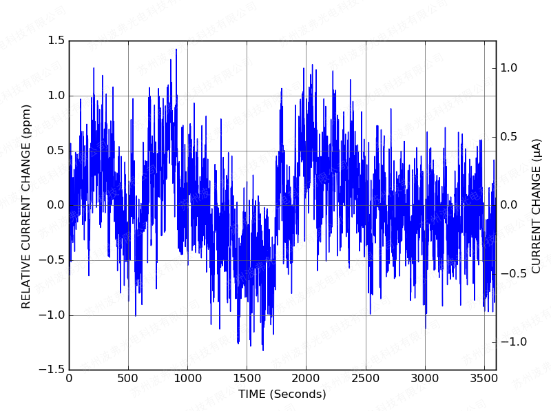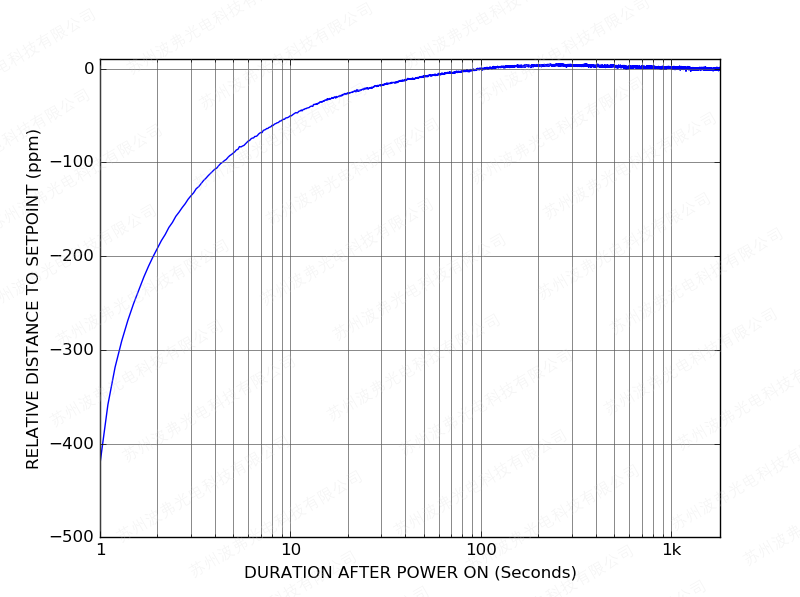 隨后上電后,CTL101控制器只需一分鐘即可將激光電流穩(wěn)定在設(shè)定值的10 ppm范圍內(nèi):