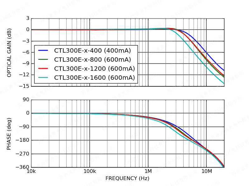 下圖顯示了CTL300E控制器在1 Vpp輸入調(diào)制電壓幅度和400 mV激光驅(qū)動器壓降下測得的調(diào)制頻率響應。