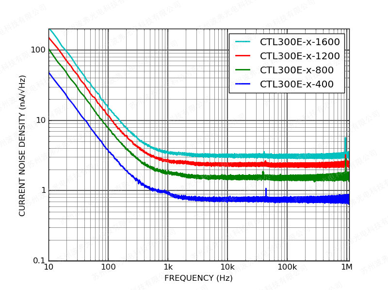 下圖顯示了CTL300E控制器在額定電流和600 mV激光驅(qū)動器壓降下工作的電流噪聲密度。