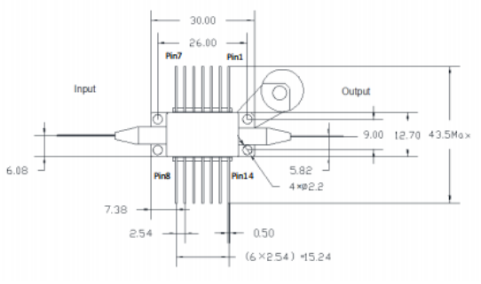 1060nm波段-15dBm飽和輸出功率-25dB增益-蝶形封裝-單模光纖-FC/APC接頭 |